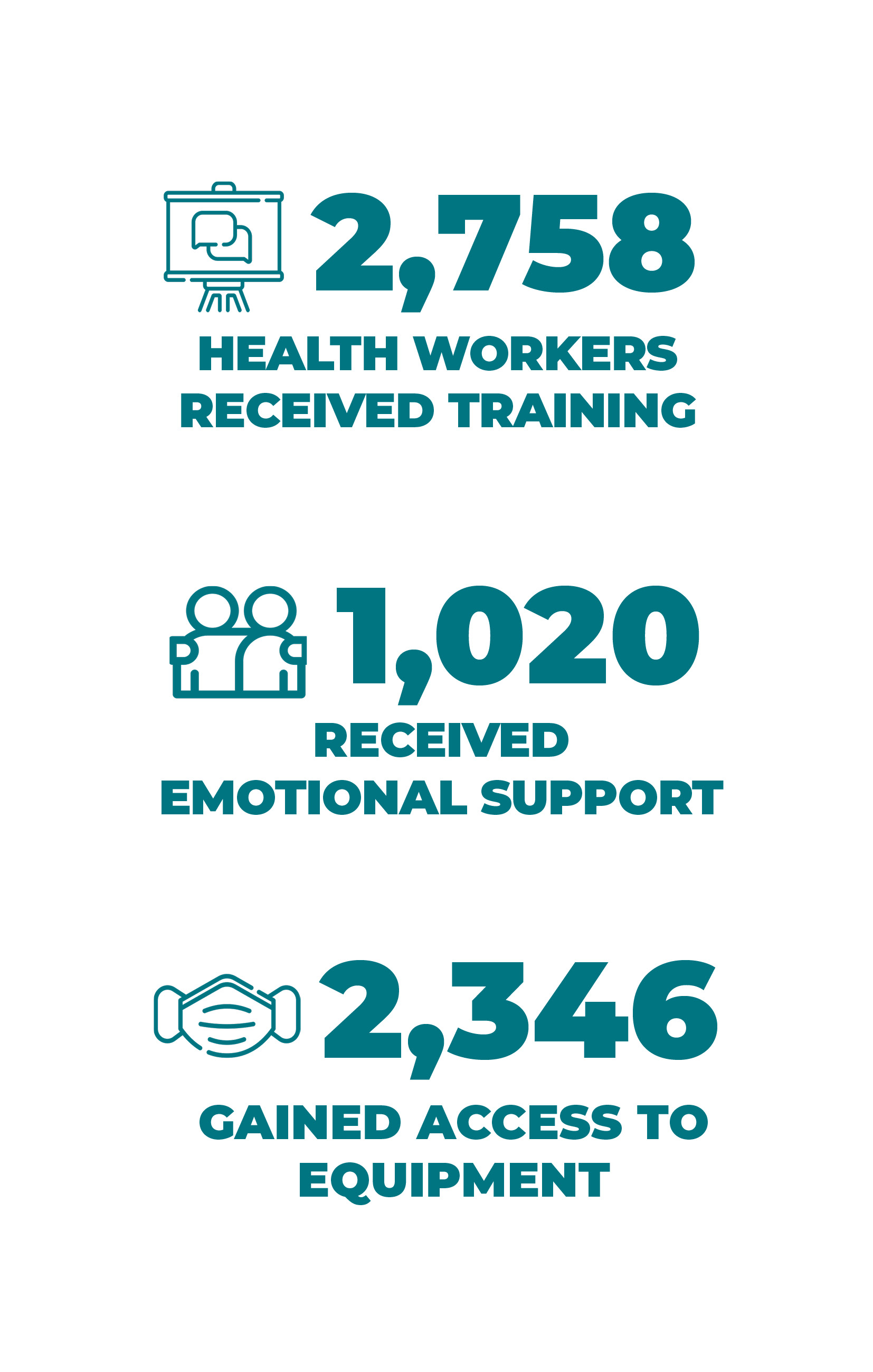 Through these partnerships, 2,578 health workers have received training, 2,346 have gained access to protective equipment and infection, prevention and control products, and a further 1,020 have received emotional or psychosocial support.