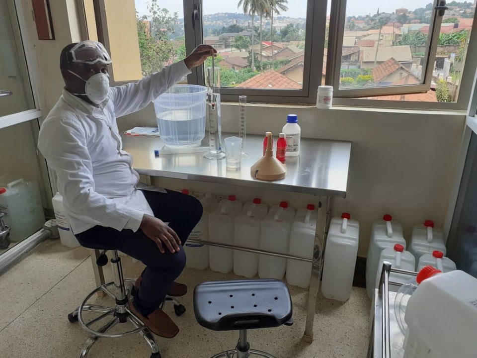 Ronald producing alcohol hand rub at the Kawempe National Referral Hospital in Kampala.